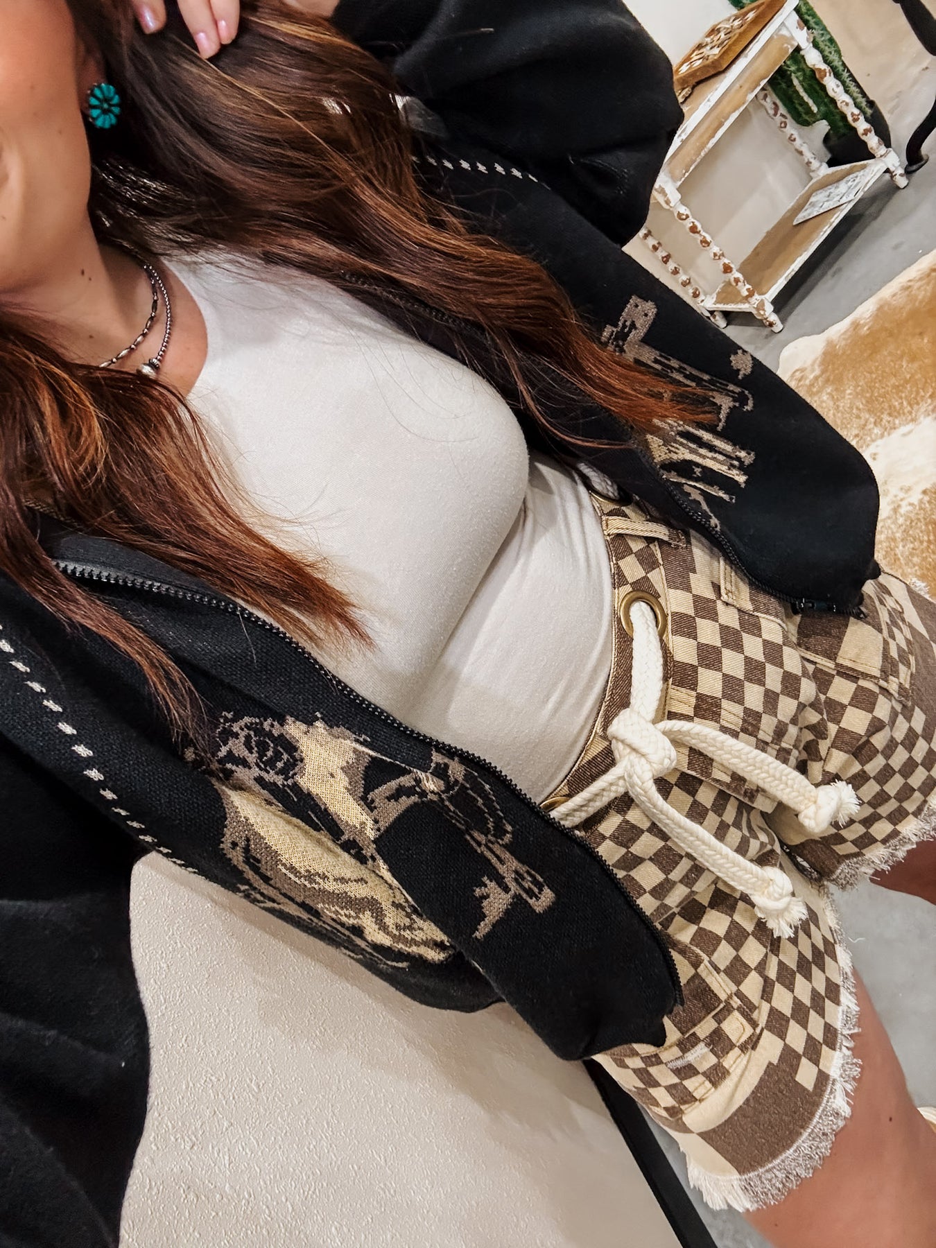 + Checkered print denim shorts with braided waist belt