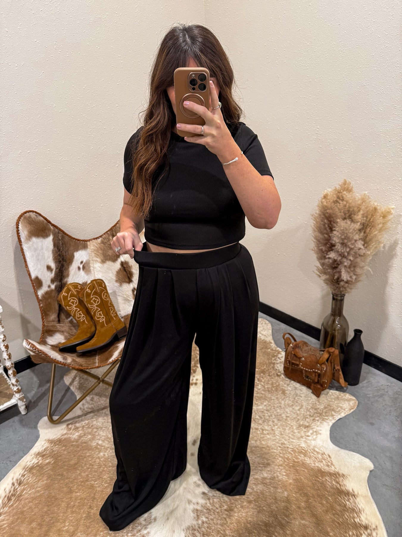 + 2 Piece lounge set with cropped baby tee and wide leg pant. This set can be mixed an matched with so many items in your closet for a relaxed and laid back look, or a look worth going out in!