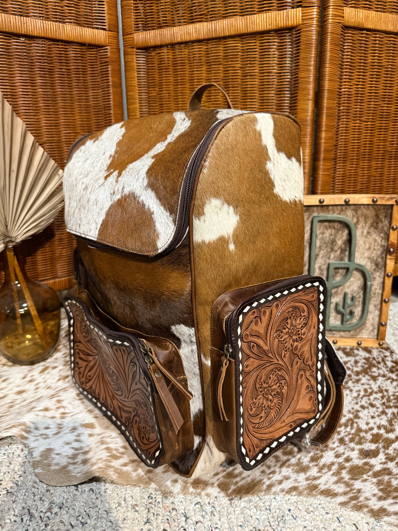+ Carry your essentials in style with this gorgeous cowhide backpack. Oversized tooled leather and cowhide backpack that is perfect for school, work, diaper bag, or just to haul in your car! This also makes a great carry on for your next trip.