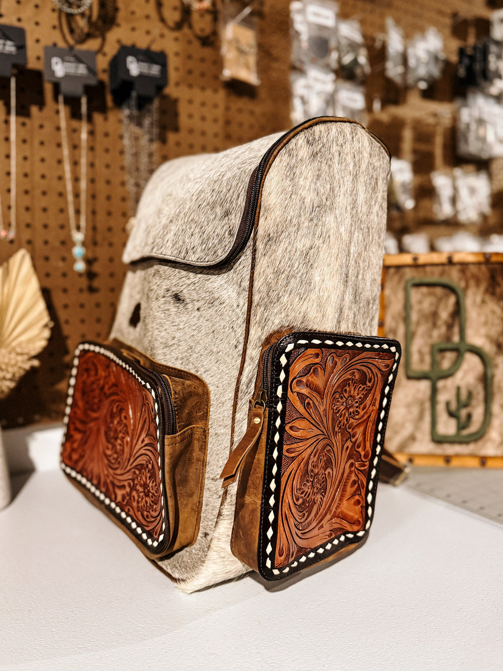 + Carry your essentials in style with this gorgeous cowhide backpack. Oversized tooled leather and cowhide backpack that is perfect for school, work, diaper bag, or just to haul in your car! This also makes a great carry on for your next trip.