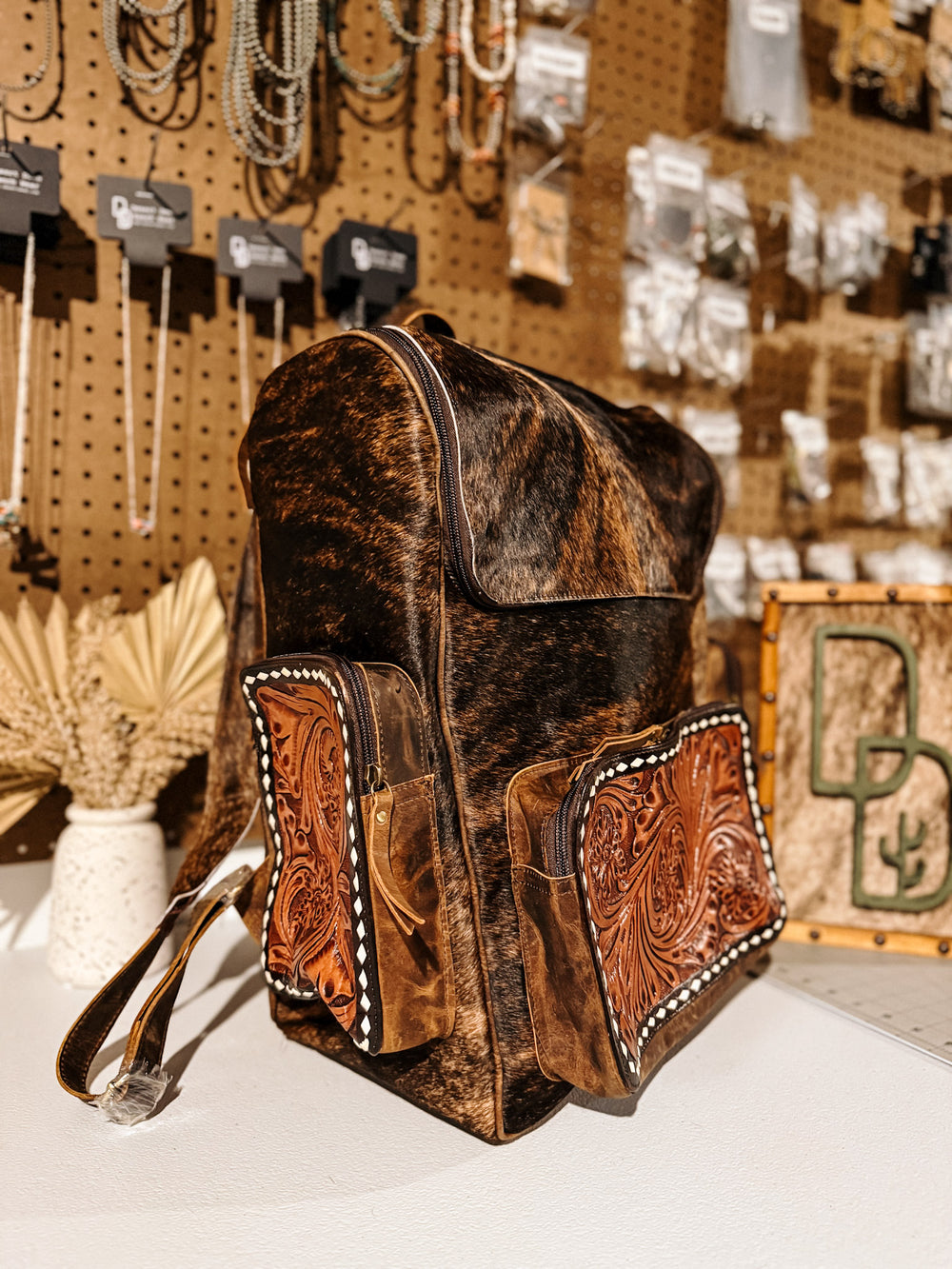 + Carry your essentials in style with this gorgeous cowhide backpack. Oversized tooled leather and cowhide backpack that is perfect for school, work, diaper bag, or just to haul in your car! This also makes a great carry on for your next trip.