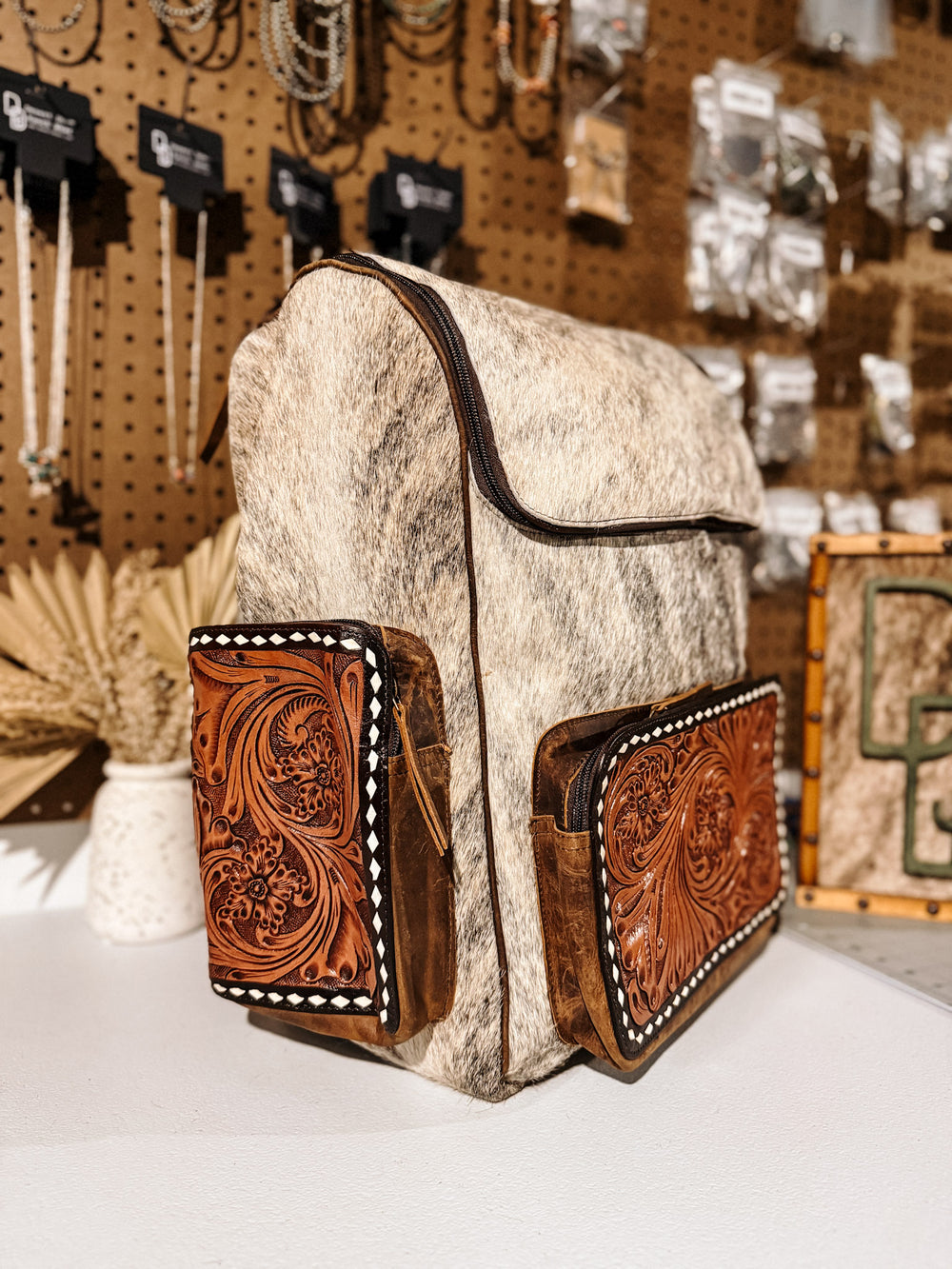 + Carry your essentials in style with this gorgeous cowhide backpack. Oversized tooled leather and cowhide backpack that is perfect for school, work, diaper bag, or just to haul in your car! This also makes a great carry on for your next trip.