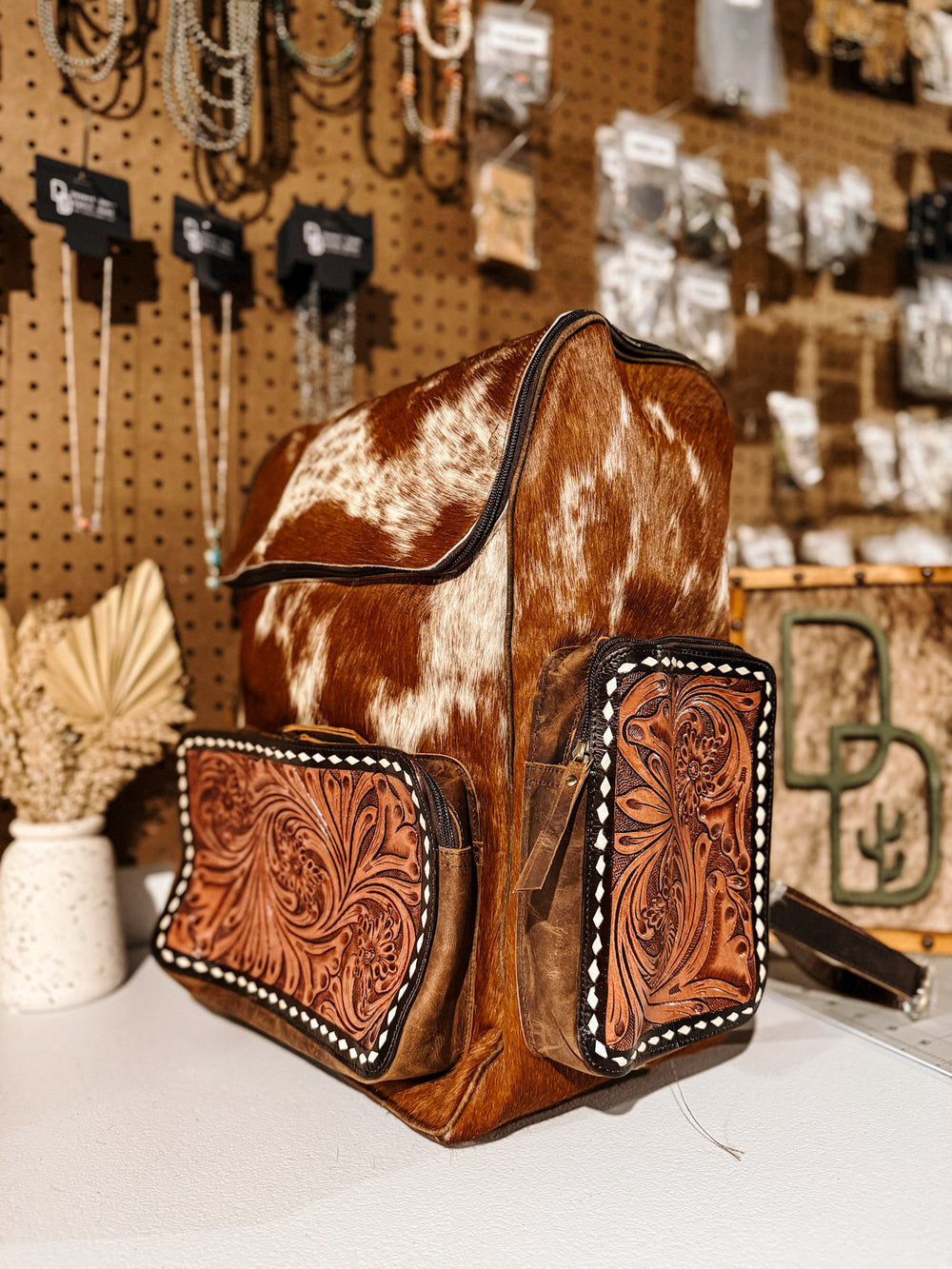 + Carry your essentials in style with this gorgeous cowhide backpack. Oversized tooled leather and cowhide backpack that is perfect for school, work, diaper bag, or just to haul in your car! This also makes a great carry on for your next trip.