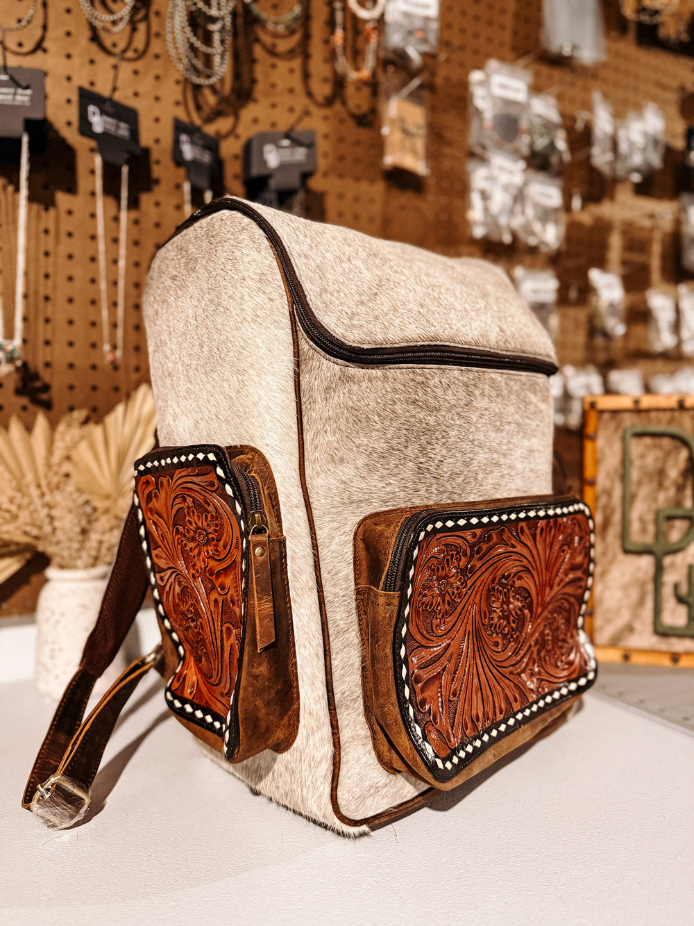 + Carry your essentials in style with this gorgeous cowhide backpack. Oversized tooled leather and cowhide backpack that is perfect for school, work, diaper bag, or just to haul in your car! This also makes a great carry on for your next trip.