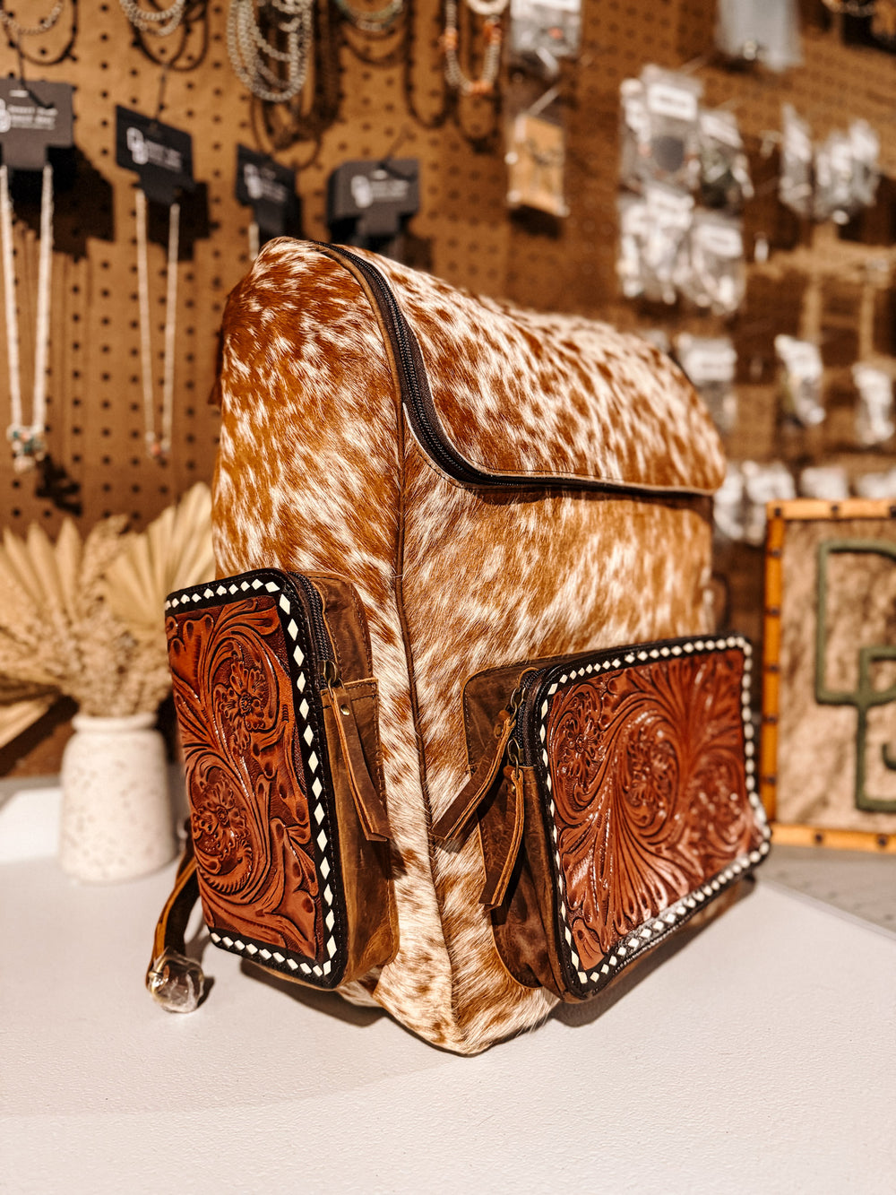 + Carry your essentials in style with this gorgeous cowhide backpack. Oversized tooled leather and cowhide backpack that is perfect for school, work, diaper bag, or just to haul in your car! This also makes a great carry on for your next trip.