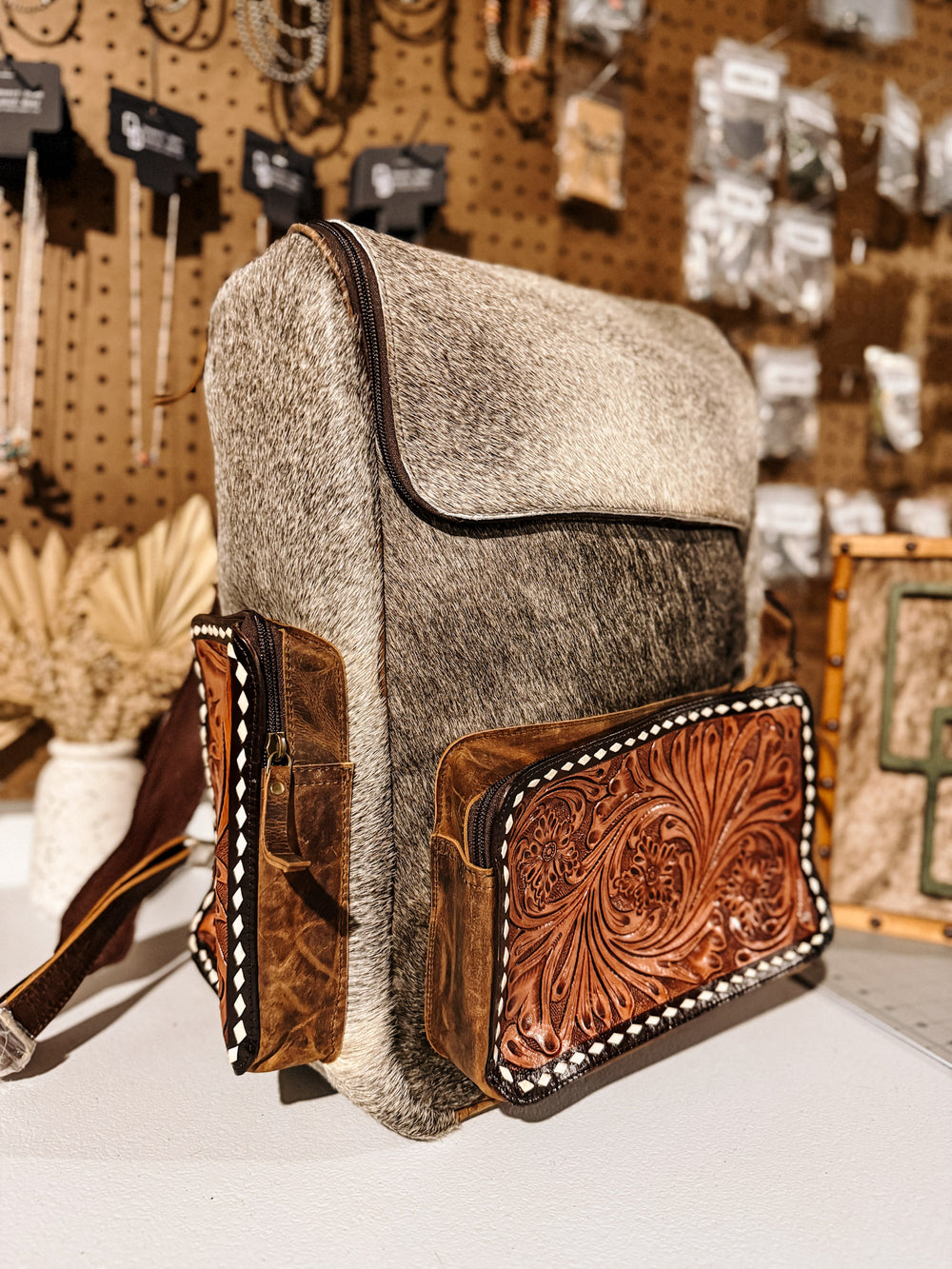 + Carry your essentials in style with this gorgeous cowhide backpack. Oversized tooled leather and cowhide backpack that is perfect for school, work, diaper bag, or just to haul in your car! This also makes a great carry on for your next trip.