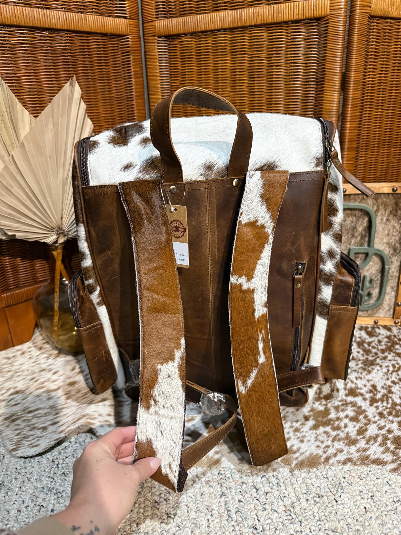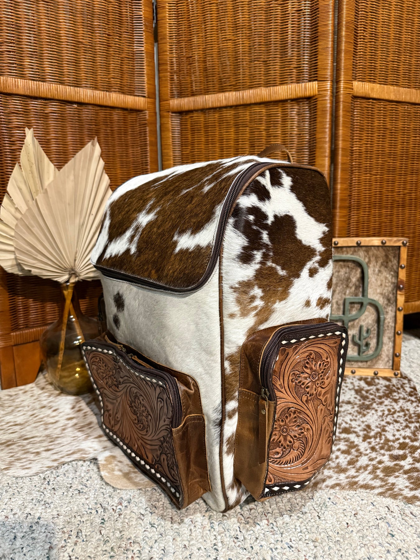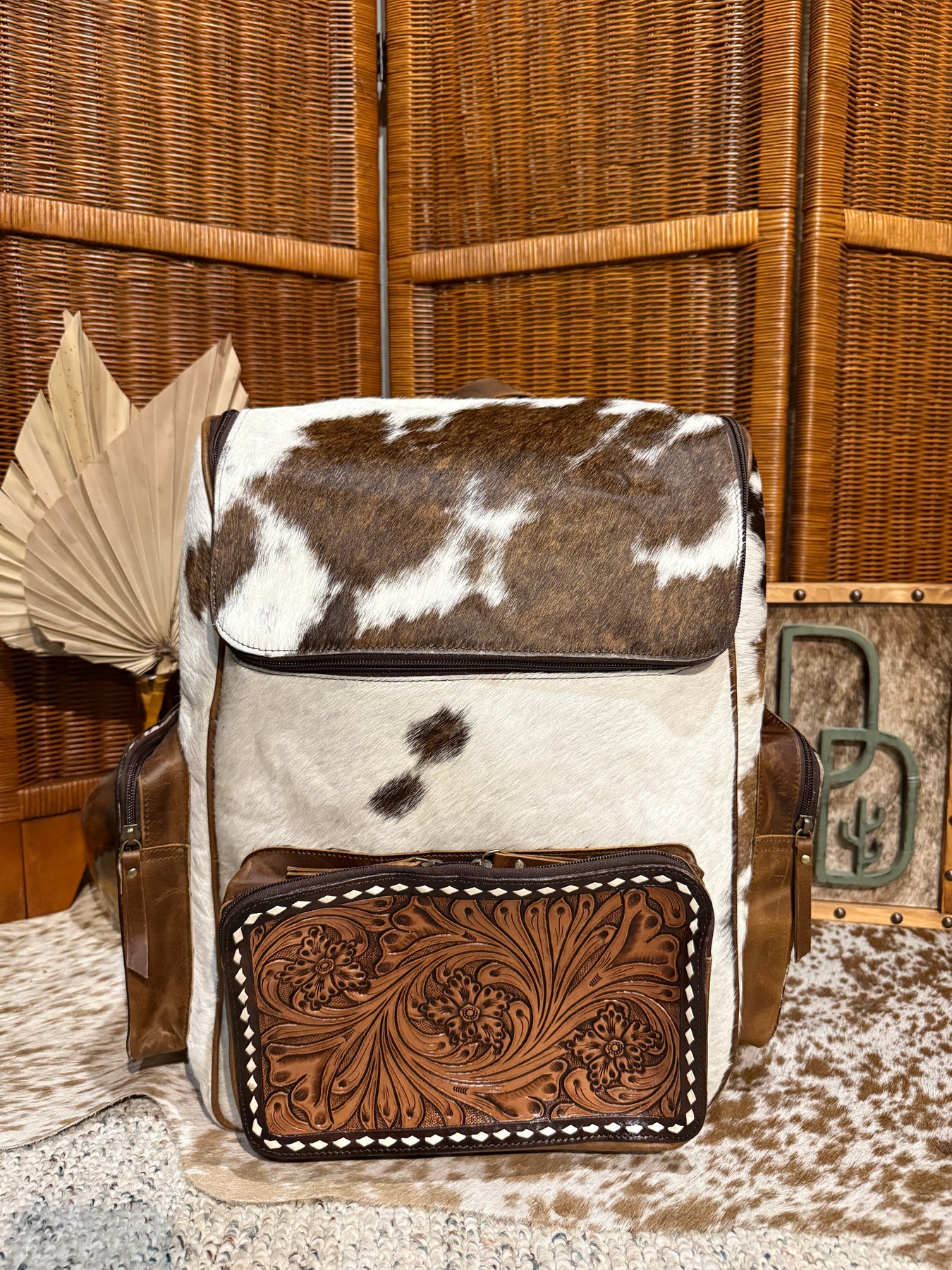+ Carry your essentials in style with this gorgeous cowhide backpack. Oversized tooled leather and cowhide backpack that is perfect for school, work, diaper bag, or just to haul in your car! This also makes a great carry on for your next trip.