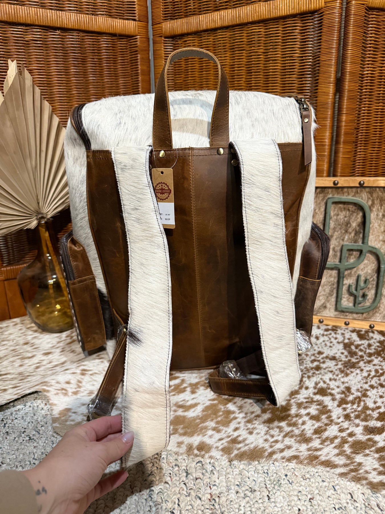 + Carry your essentials in style with this gorgeous cowhide backpack. Oversized tooled leather and cowhide backpack that is perfect for school, work, diaper bag, or just to haul in your car! This also makes a great carry on for your next trip.