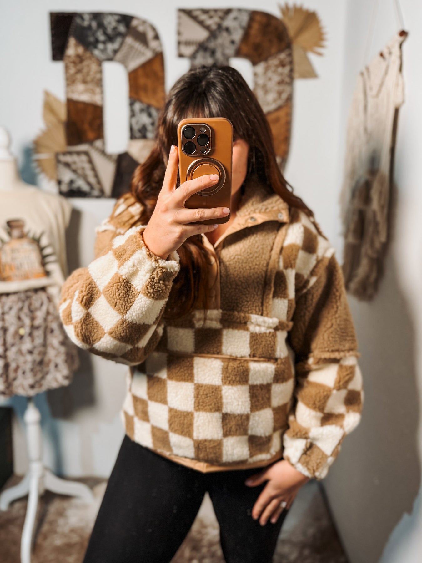 + Checkered fleece color block pullover sweater