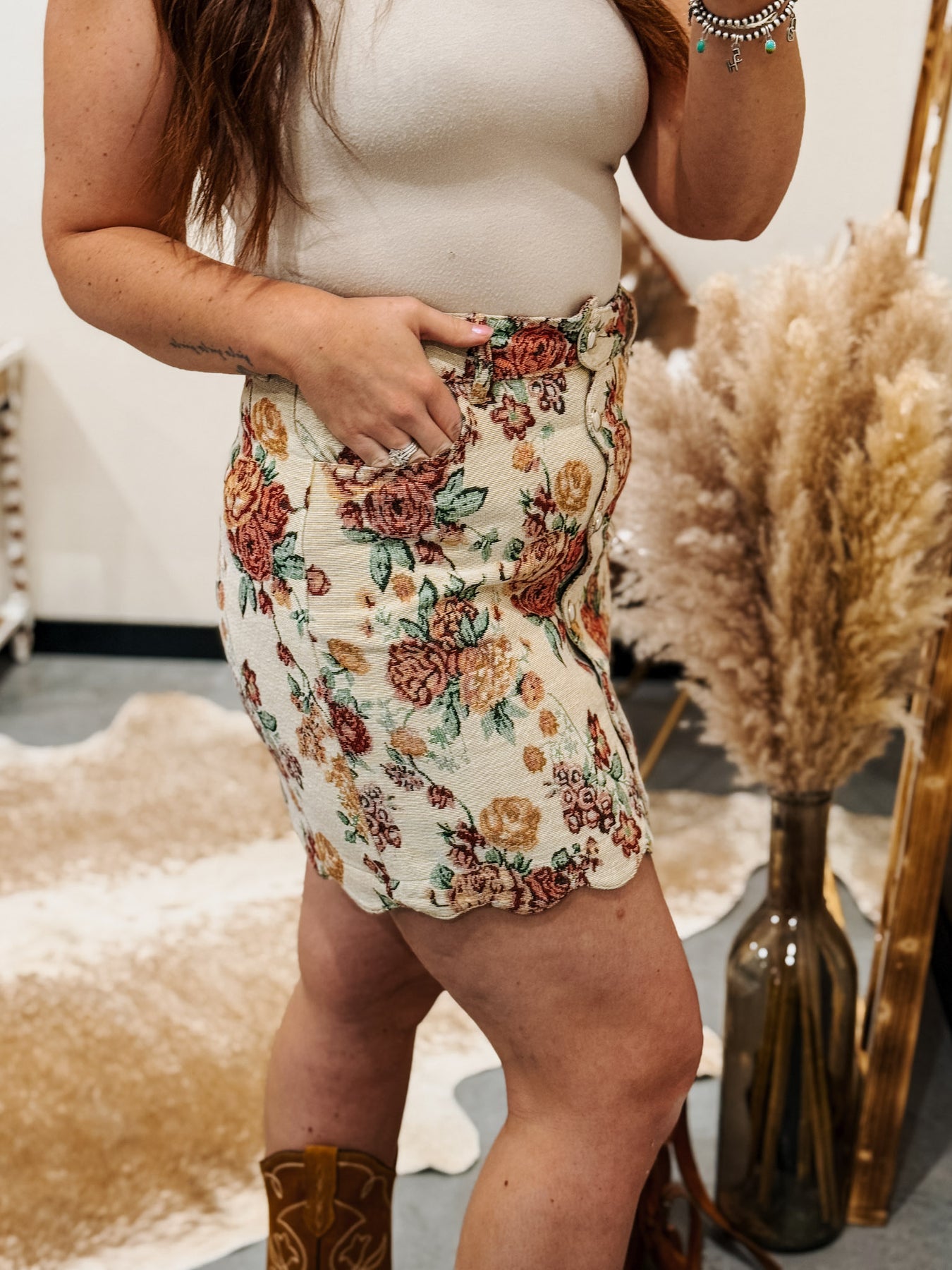 + Floral, jacquard button, mini skirt with scalloped detail