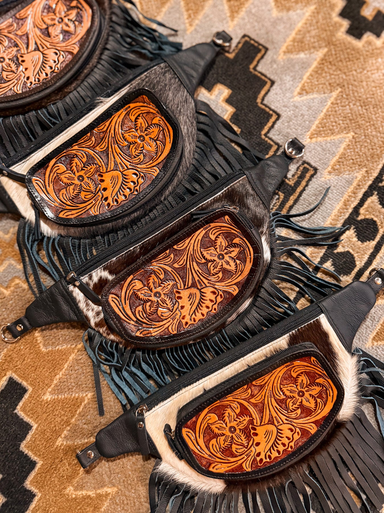 + Genuine cowhide and tooled leather fringe fanny pack