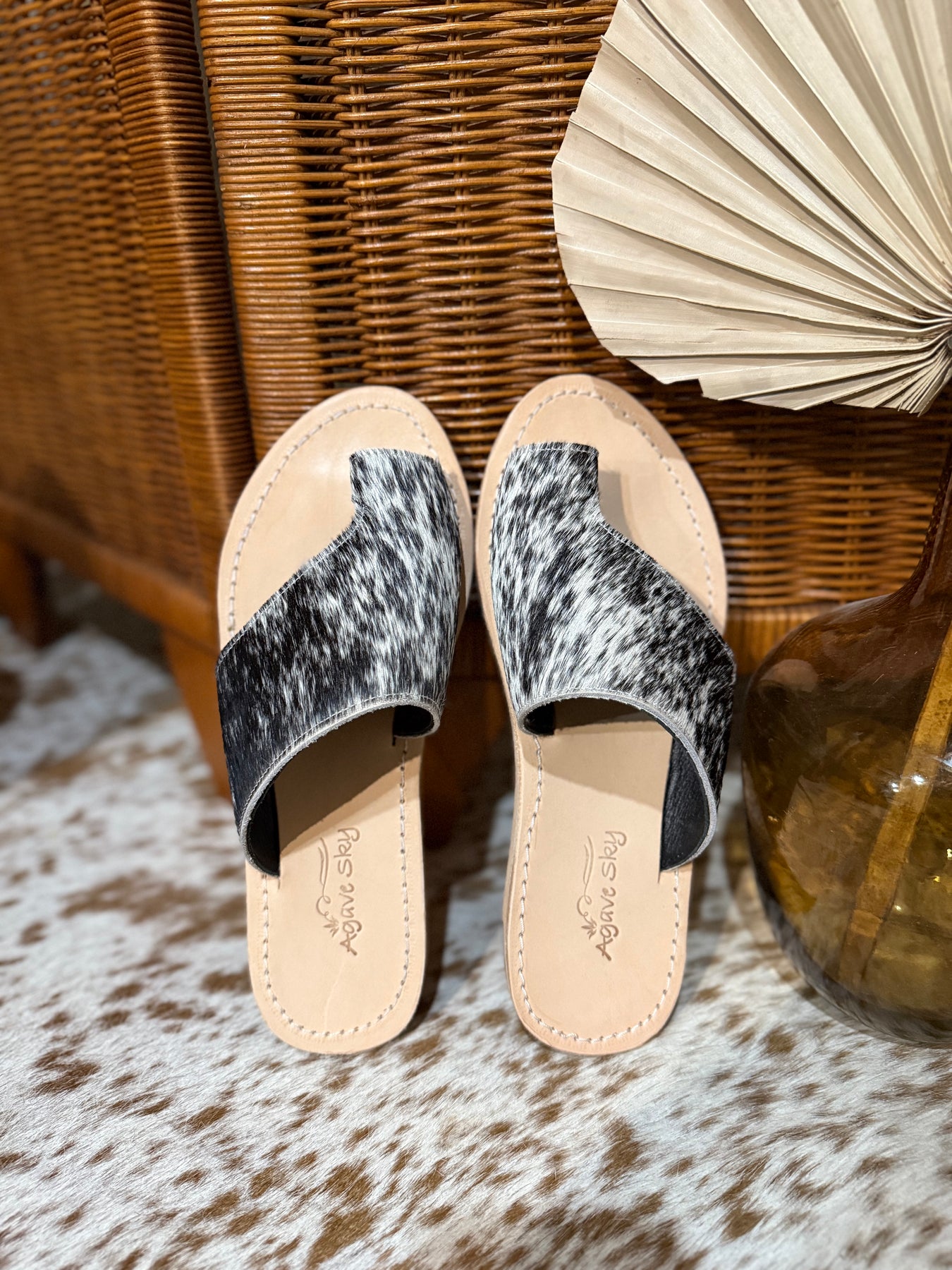 The Agave Sky original "Hide Slide" cowhide sandals are hand cut with hair-on natural cowhide. Each pair is truly one of a kind. Agave Sky uses real hair on cowhide for our cowhide sandals, nothing printed or artificial, to create your unique slides. All Agave Sky slides are available in whole sizes and run a little large. Half sizes should order the next size down. ex: 7.5 would order a 7.