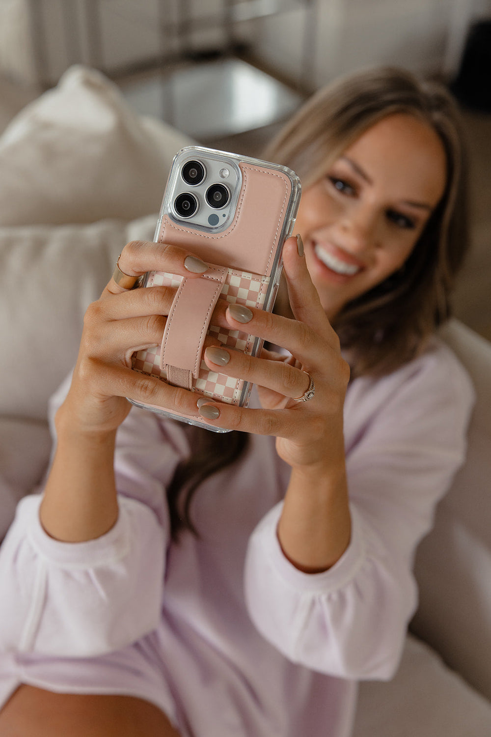 Pair this case with the coordinating Blush Check wrist lanyard and Apple watch band and you're good to go!