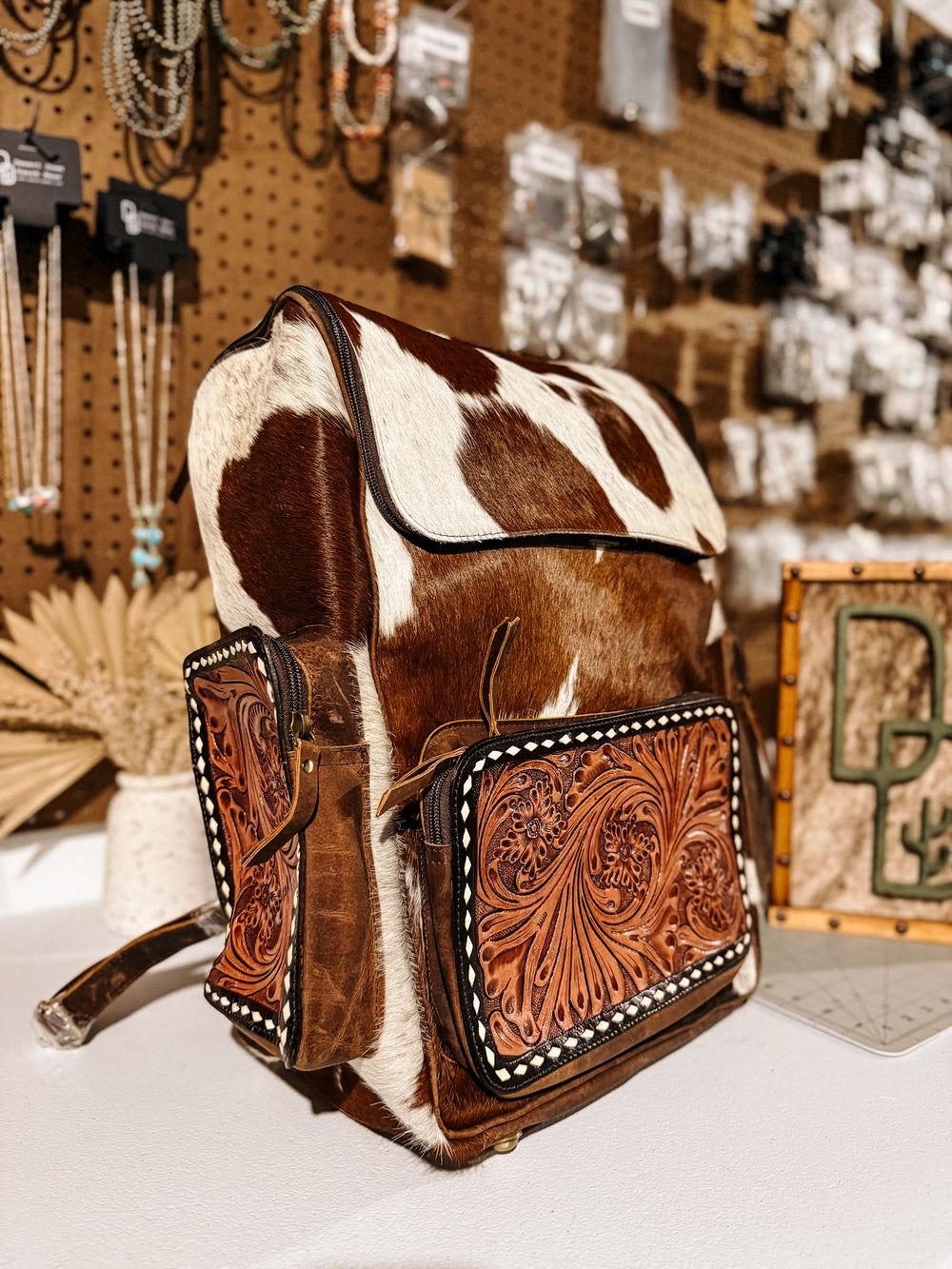 + Carry your essentials in style with this gorgeous cowhide backpack. Oversized tooled leather and cowhide backpack that is perfect for school, work, diaper bag, or just to haul in your car! This also makes a great carry on for your next trip.