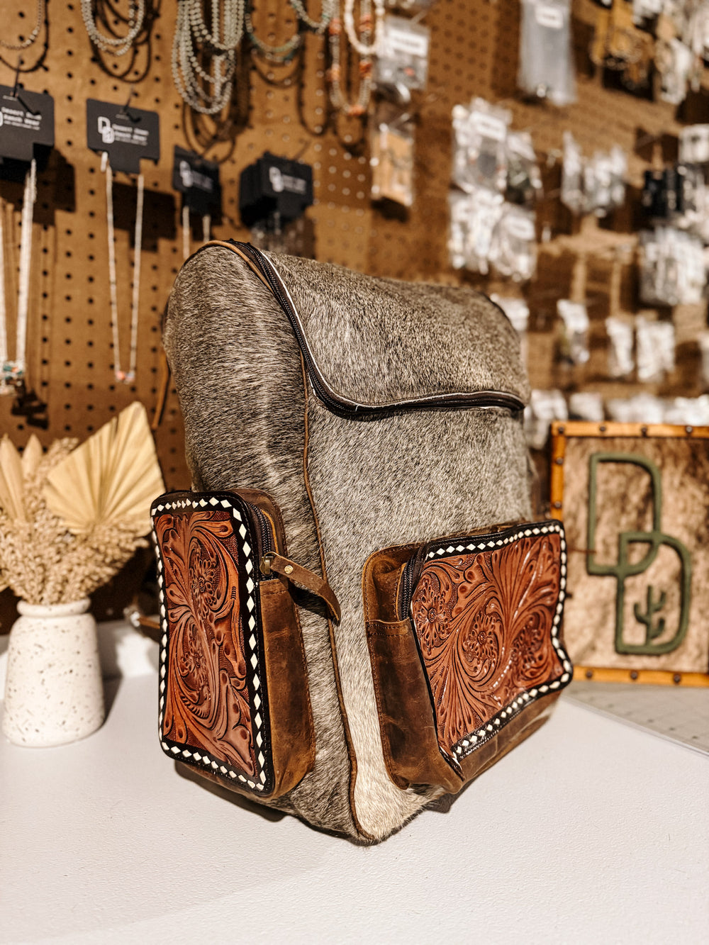 + Carry your essentials in style with this gorgeous cowhide backpack. Oversized tooled leather and cowhide backpack that is perfect for school, work, diaper bag, or just to haul in your car! This also makes a great carry on for your next trip.