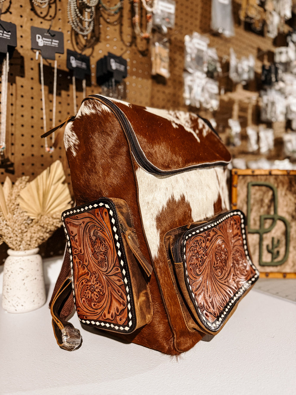 + Carry your essentials in style with this gorgeous cowhide backpack. Oversized tooled leather and cowhide backpack that is perfect for school, work, diaper bag, or just to haul in your car! This also makes a great carry on for your next trip.