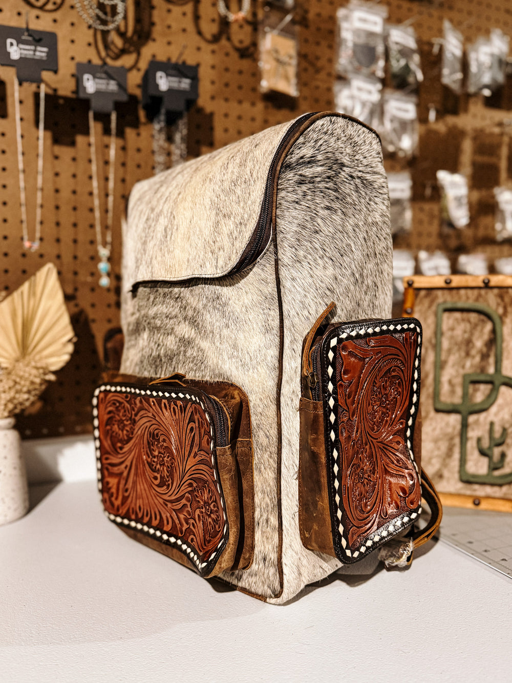 + Carry your essentials in style with this gorgeous cowhide backpack. Oversized tooled leather and cowhide backpack that is perfect for school, work, diaper bag, or just to haul in your car! This also makes a great carry on for your next trip.