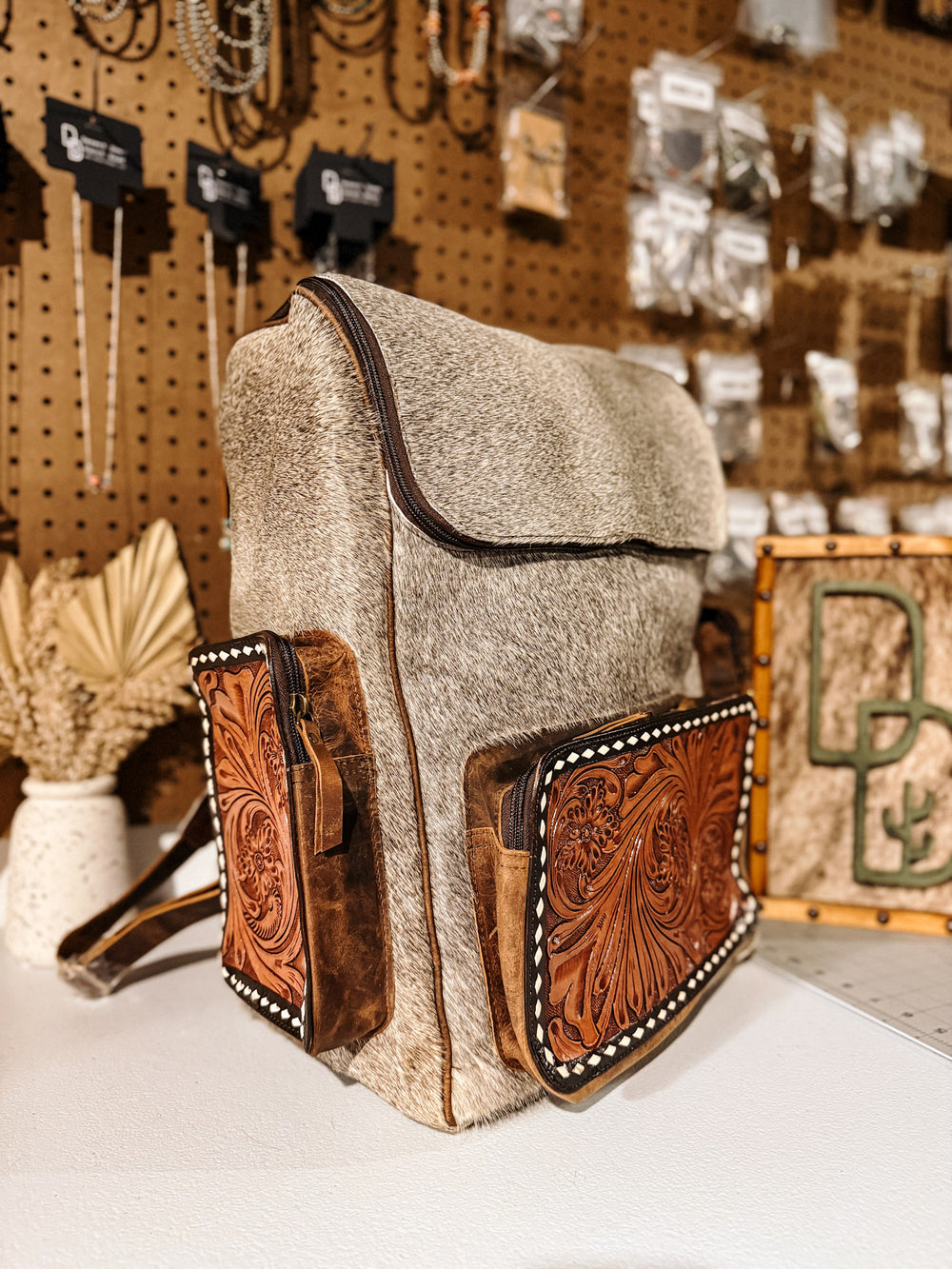 + Carry your essentials in style with this gorgeous cowhide backpack. Oversized tooled leather and cowhide backpack that is perfect for school, work, diaper bag, or just to haul in your car! This also makes a great carry on for your next trip.