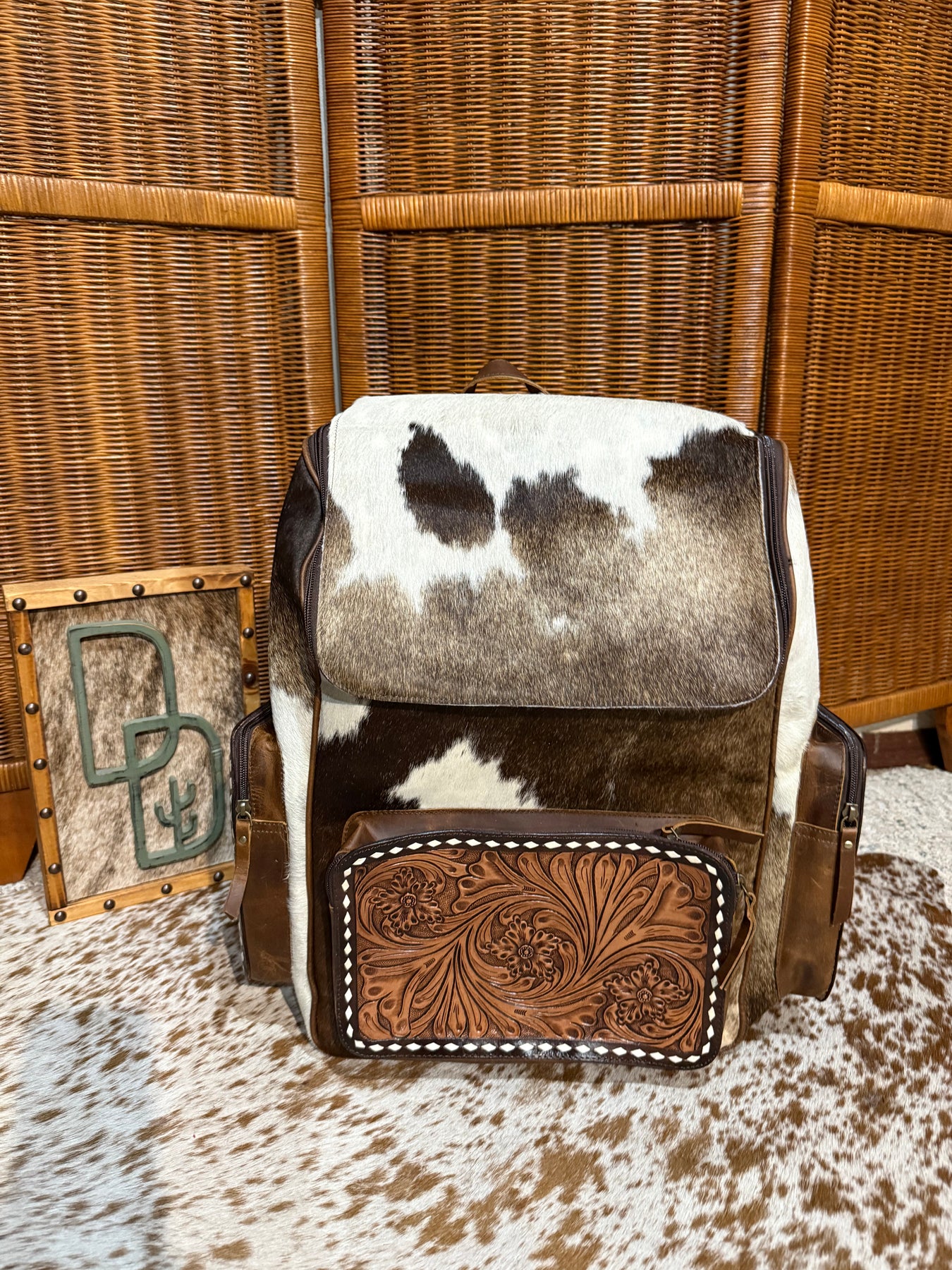 + Carry your essentials in style with this gorgeous cowhide backpack. Oversized tooled leather and cowhide backpack that is perfect for school, work, diaper bag, or just to haul in your car! This also makes a great carry on for your next trip.
