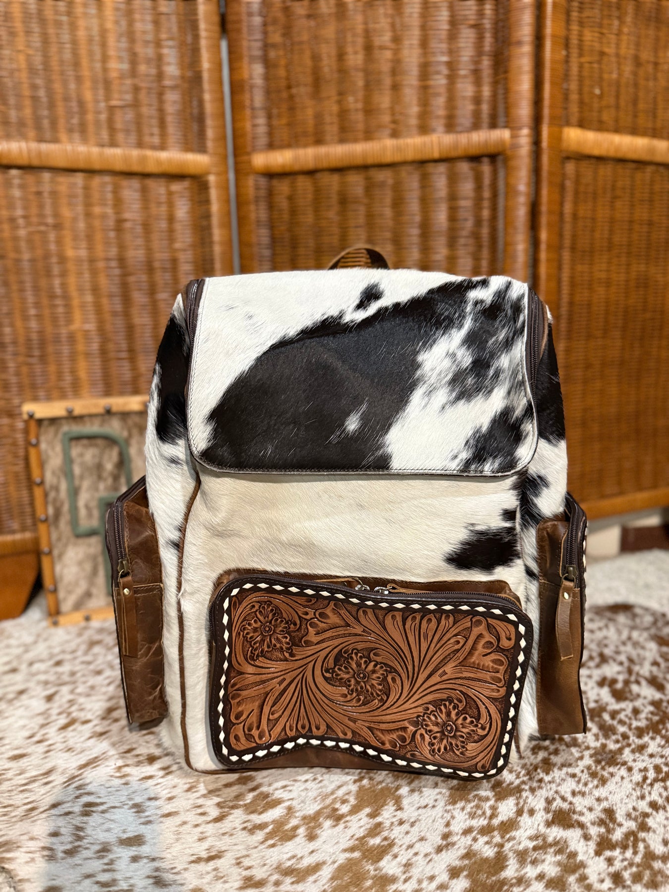 + Carry your essentials in style with this gorgeous cowhide backpack. Oversized tooled leather and cowhide backpack that is perfect for school, work, diaper bag, or just to haul in your car! This also makes a great carry on for your next trip.