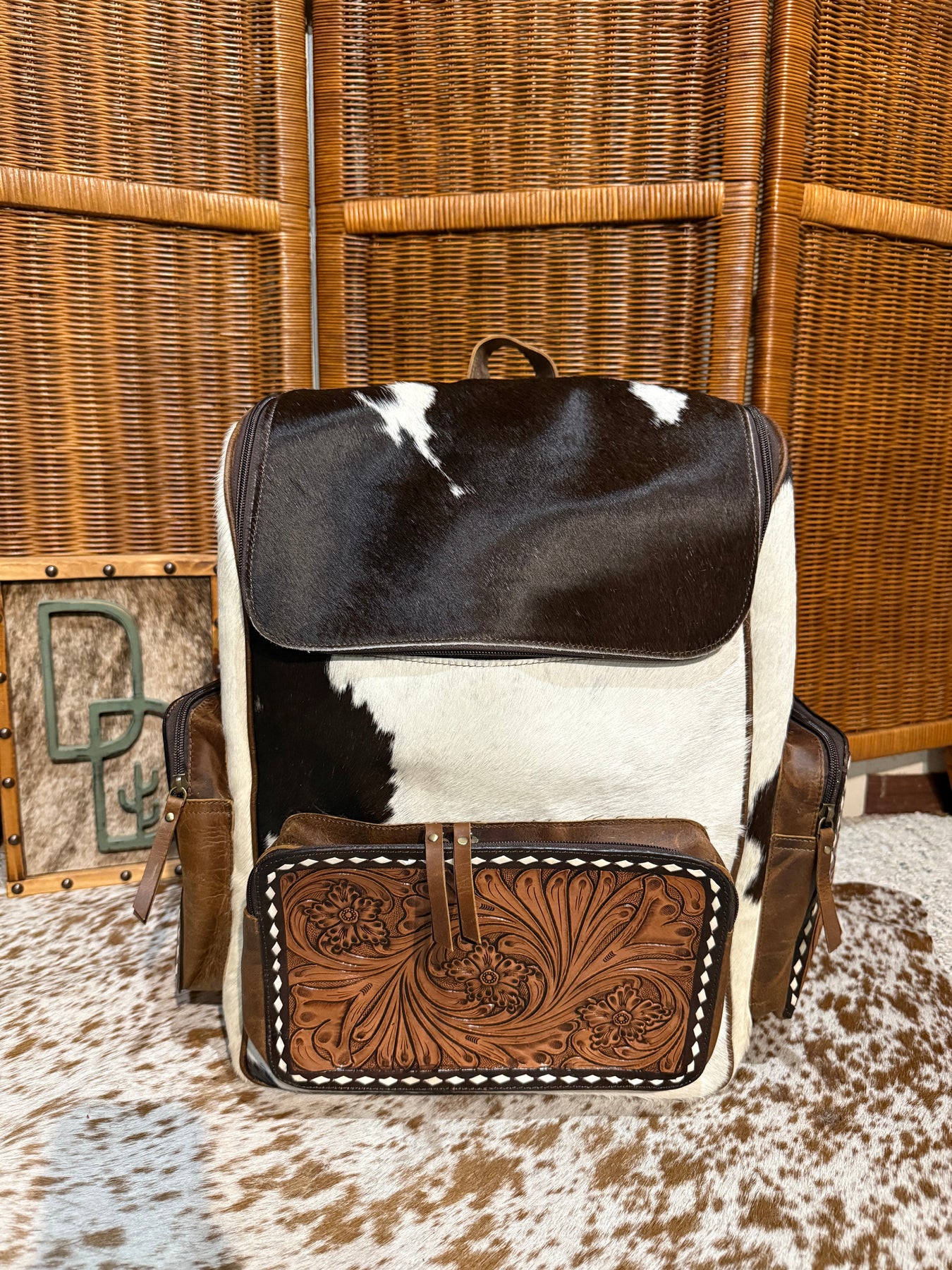 + Carry your essentials in style with this gorgeous cowhide backpack. Oversized tooled leather and cowhide backpack that is perfect for school, work, diaper bag, or just to haul in your car! This also makes a great carry on for your next trip.